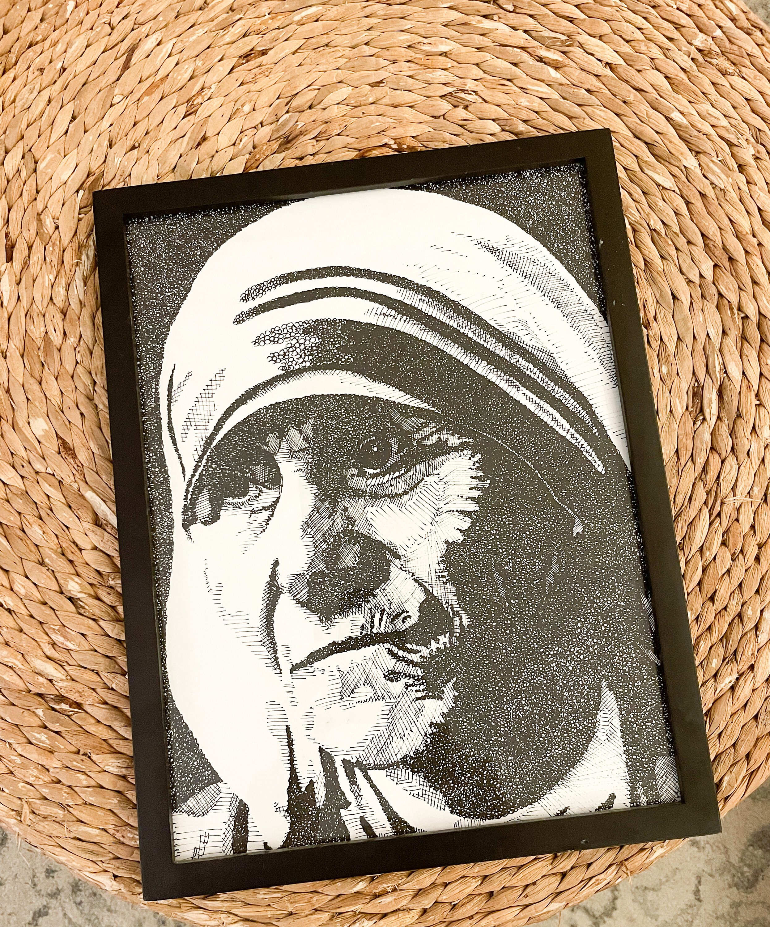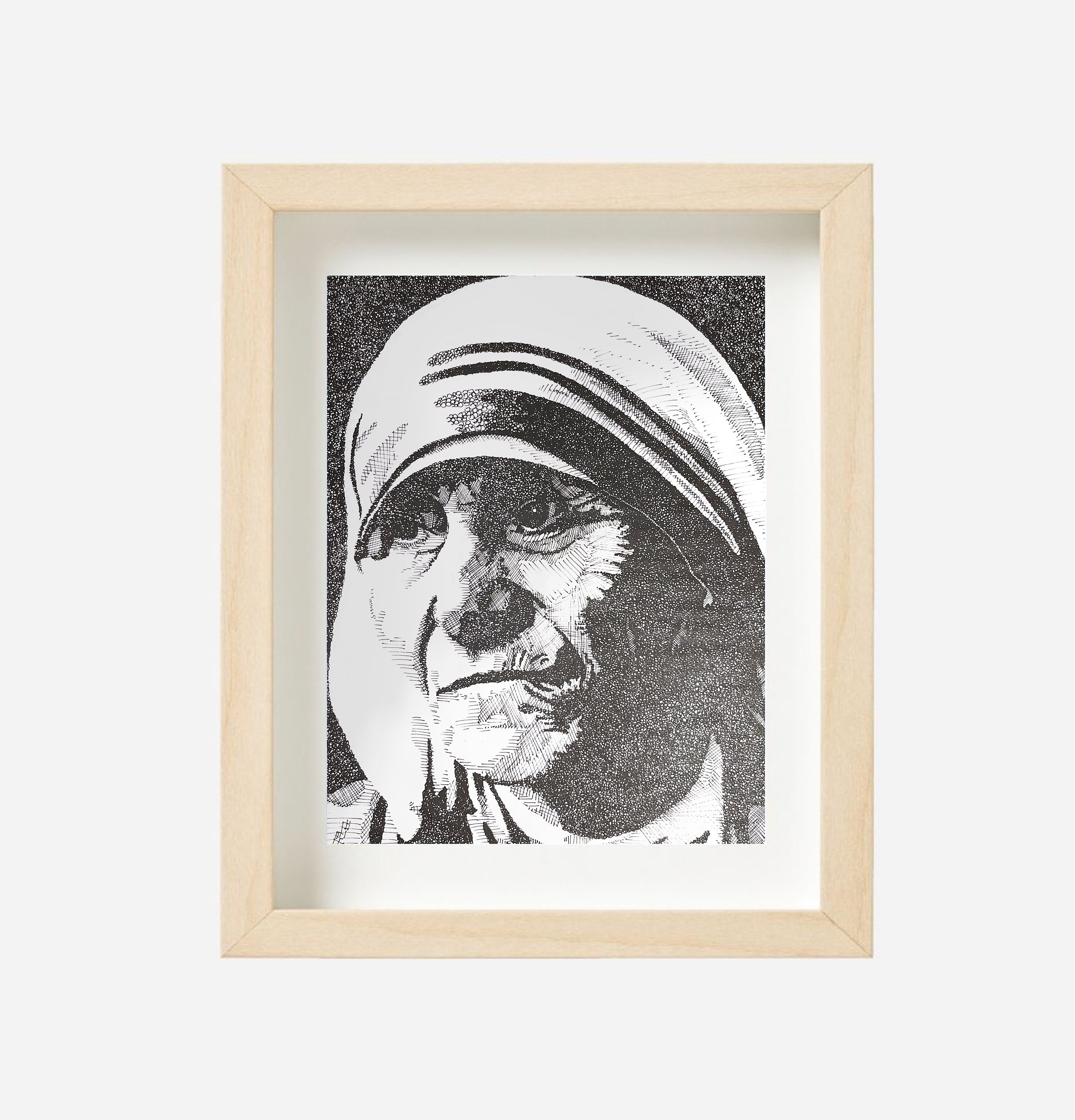 Print of hand-drawn portrait of St. Teresa of Calcutta in black pen.