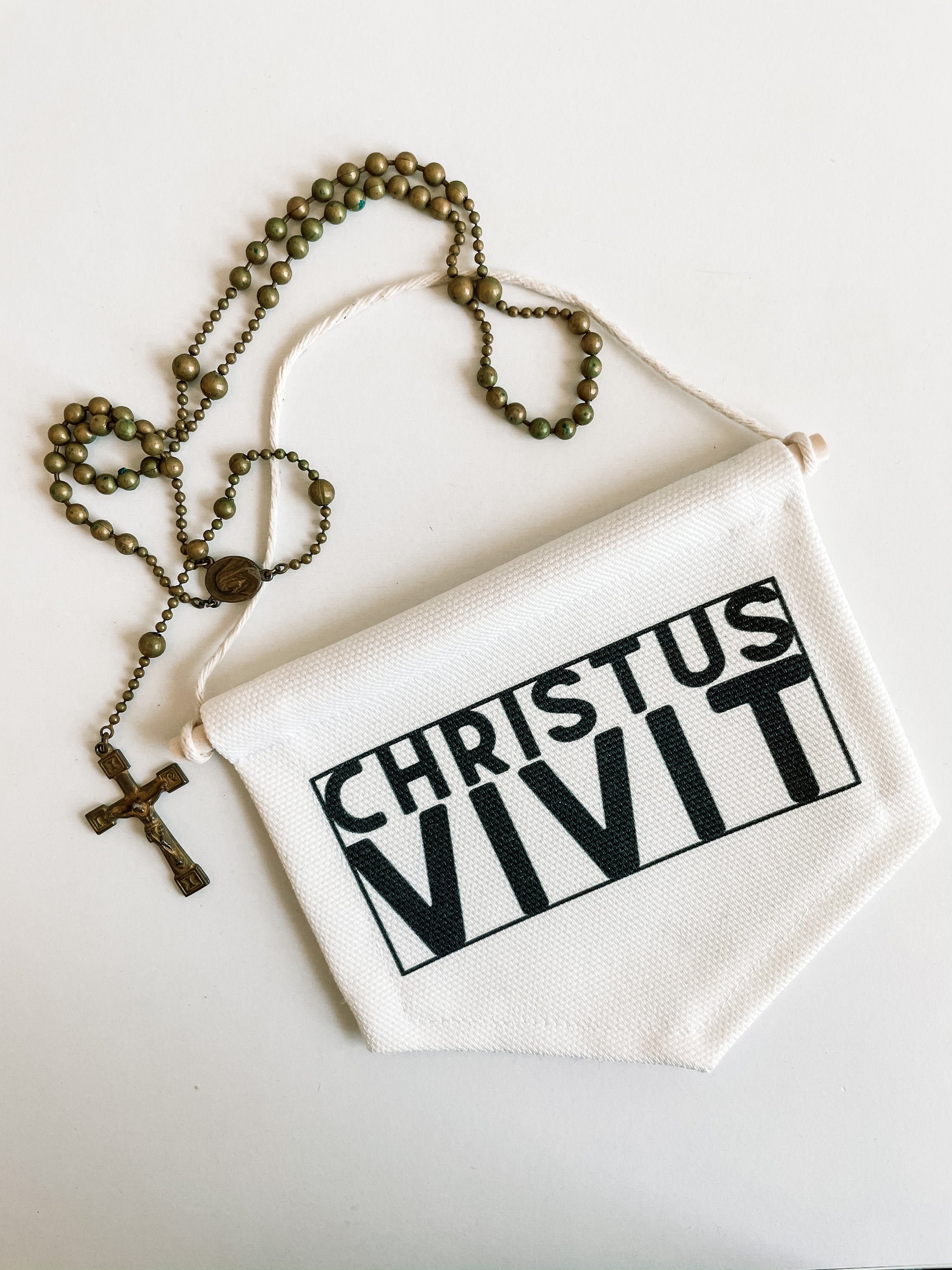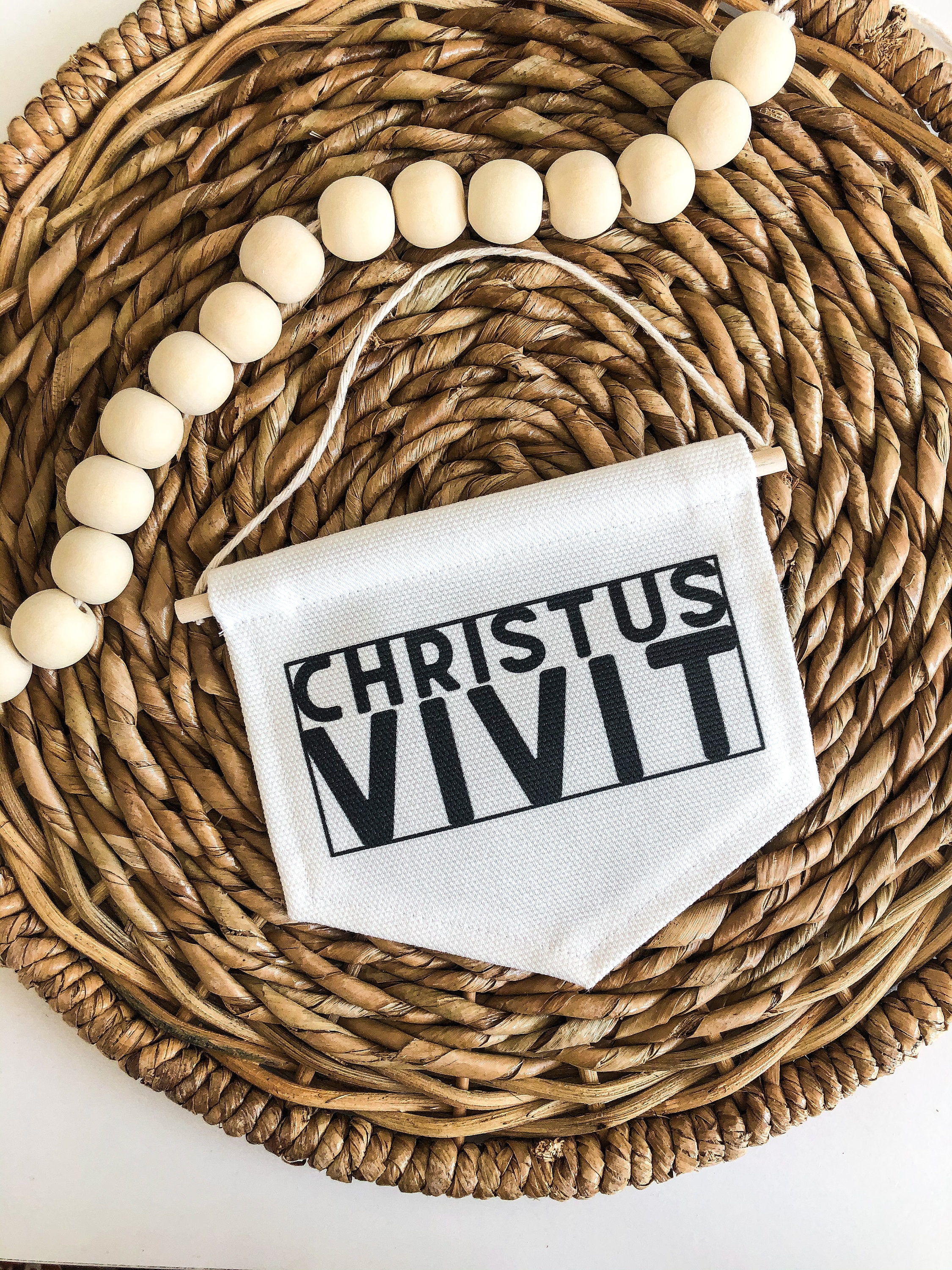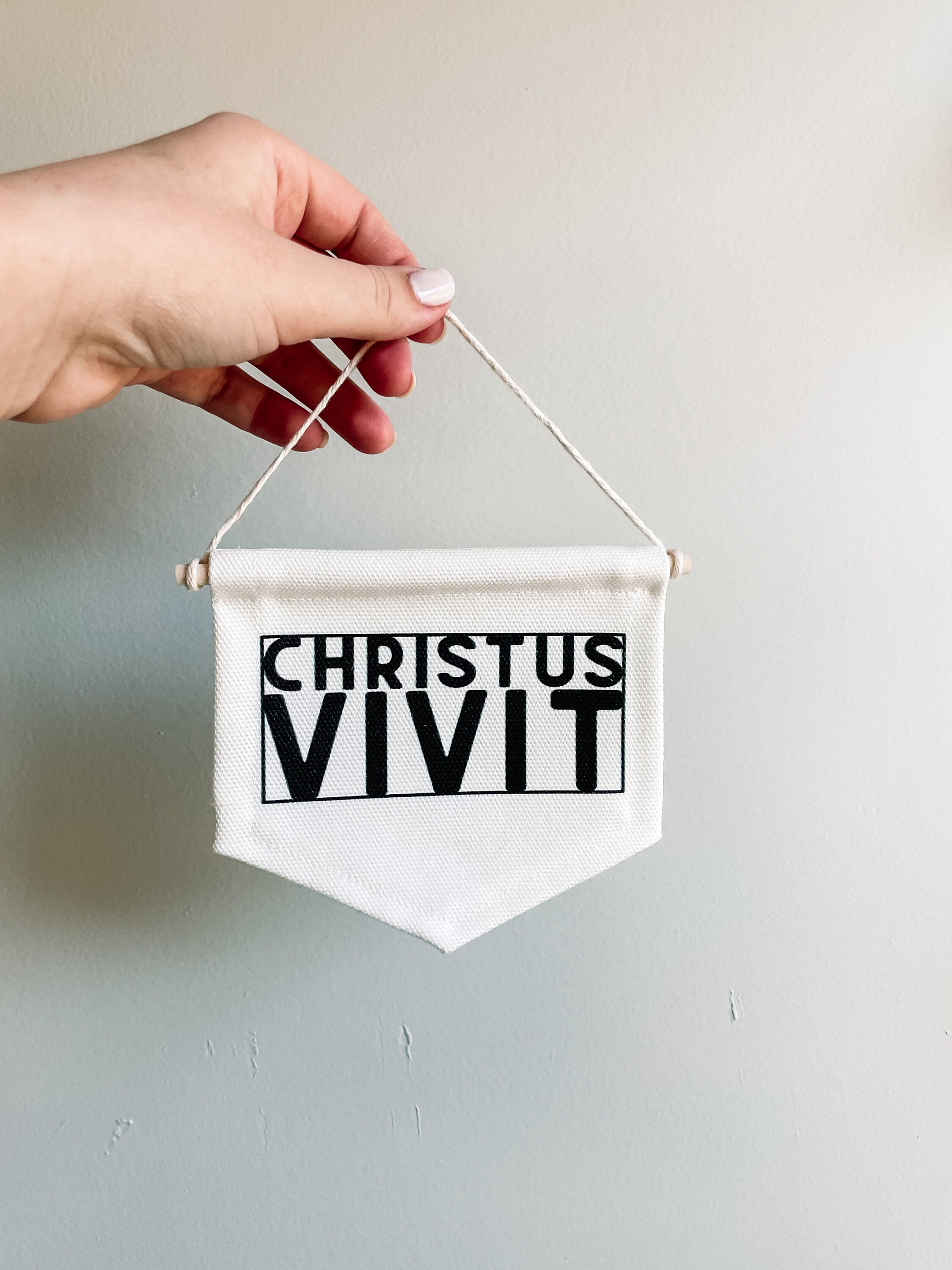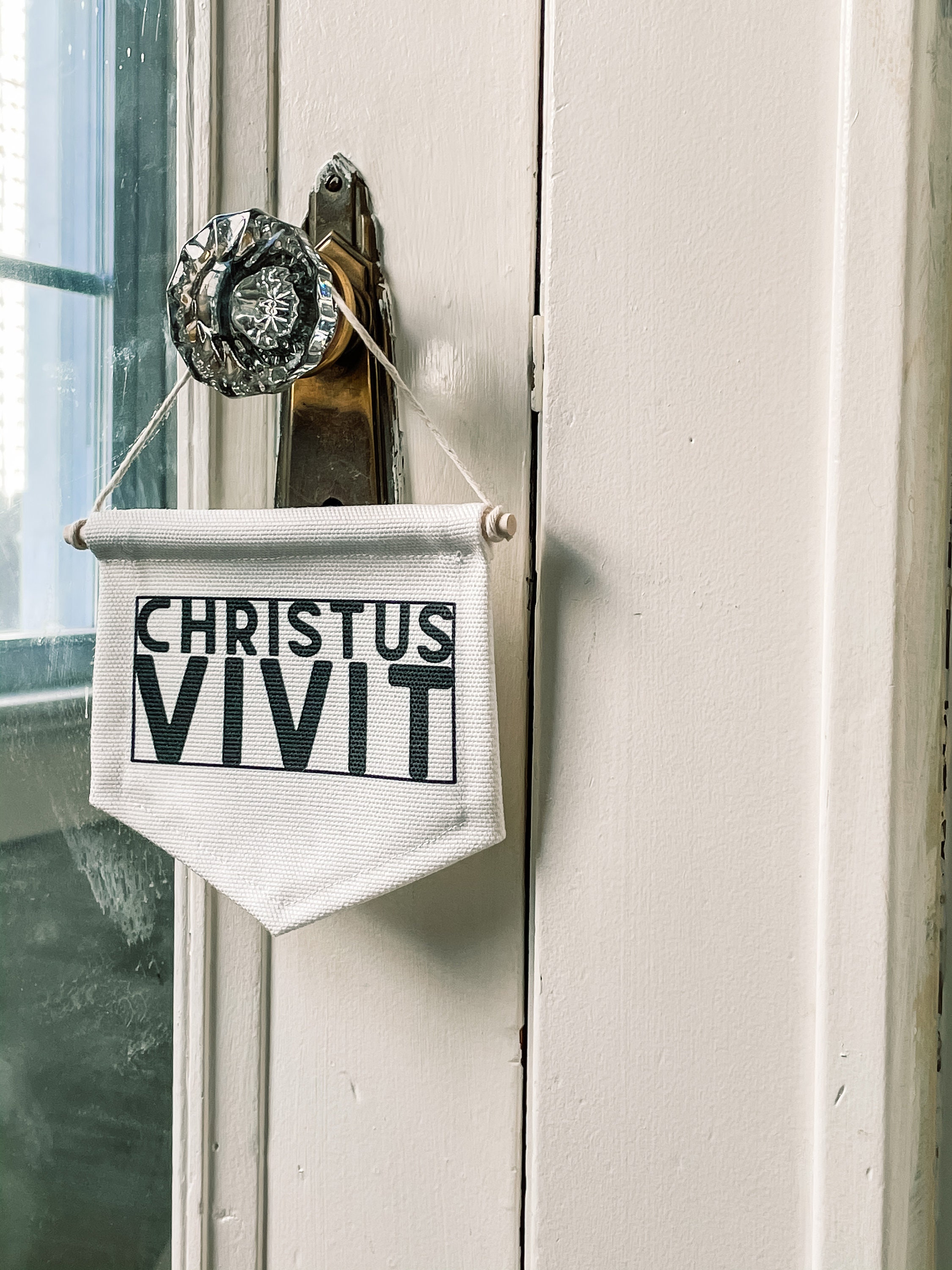 WHAT'S INCLUDED This listing includes a hand-sewn pennant wallhanging of the words "CHRISTUS VIVIT" (Christ is Alive) printed onto Cypress cotton canvas fabric. (Pennant comes with wooden dowel and string.)